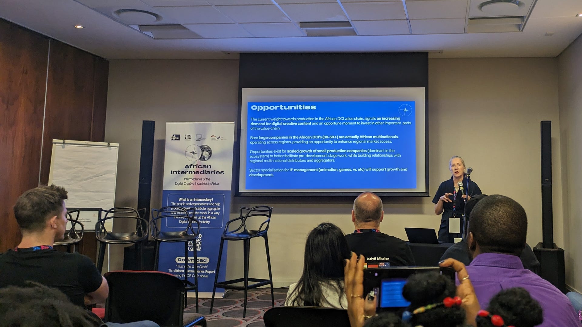 Bristow defined intermediaries as "the people and organisations who help produce, develop, distribute, aggregate, and monetise creative work in a way that helps to scale up the African Digital Creative Industry." That includes the entire value chain from pre-production (incubation, funding, infrastructure development, pitching, and more), to production and distribution (established studios, publishers, distributors and so on).